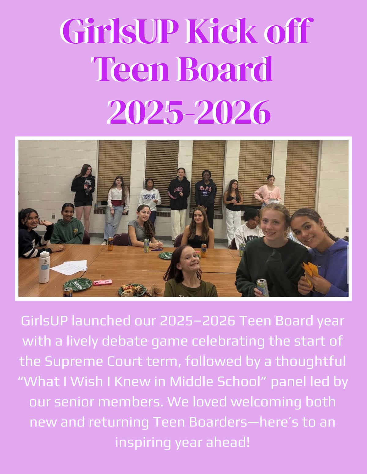 GirlsUP launched our 2025–2026 Teen Board year with a lively debate game celebrating the start of the Supreme Court term, followed by a thoughtful “What I Wish I Knew in Middle School” panel led by our senior members. We loved welcoming both new and returning Teen Boarders—here’s to an inspiring year ahead!